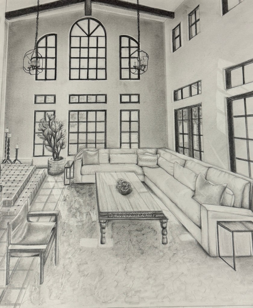 This hand-drawn interior perspective was created using graphite pencil to explore form, shading, and architectural detail. The space features a double-height living room with dramatic windows, a sectional sofa, and layered textures from tile to textiles. Careful attention was given to light source, scale, and perspective to communicate depth and spatial relationships clearly.