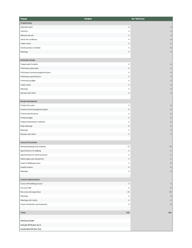This Fee Estimate was created as part of my Professional Practices coursework to illustrate my understanding of project planning, time management, and client communication within the design process. The document outlines estimated hours and cost expectations for a full-scope interior design project.