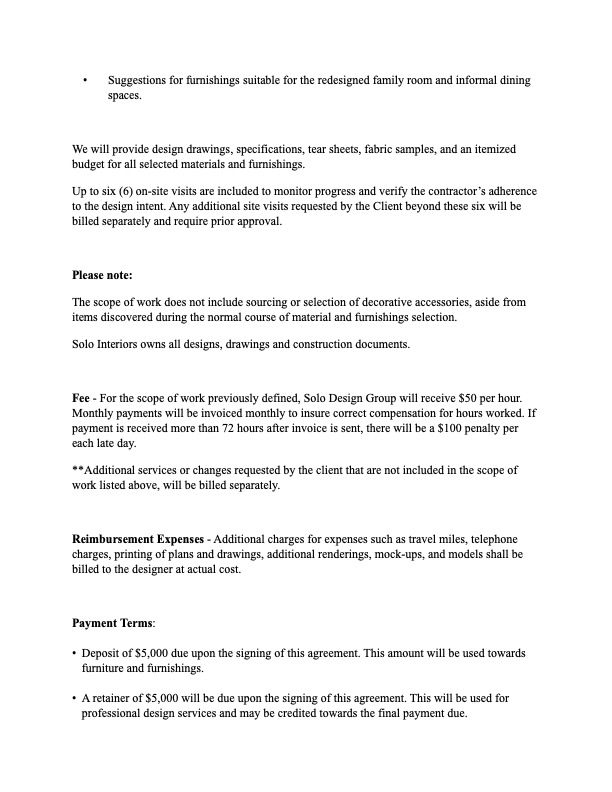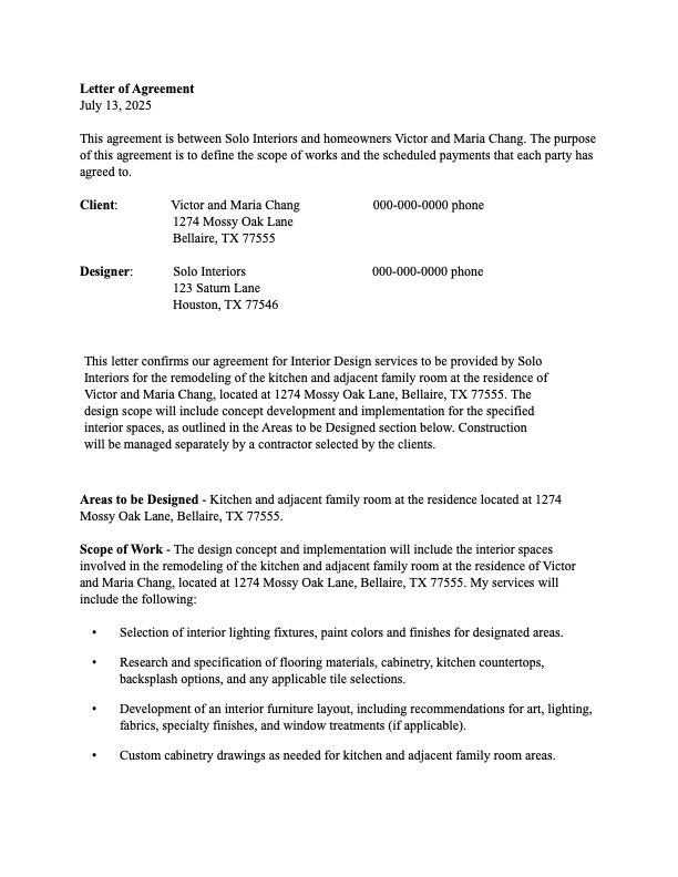 This Letter of Agreement was developed as part of my Professional Practices coursework to demonstrate my understanding of real-world documentation used in interior design business operations. The contract outlines a professional working relationship between a designer and clients for a residential kitchen and family room remodel.