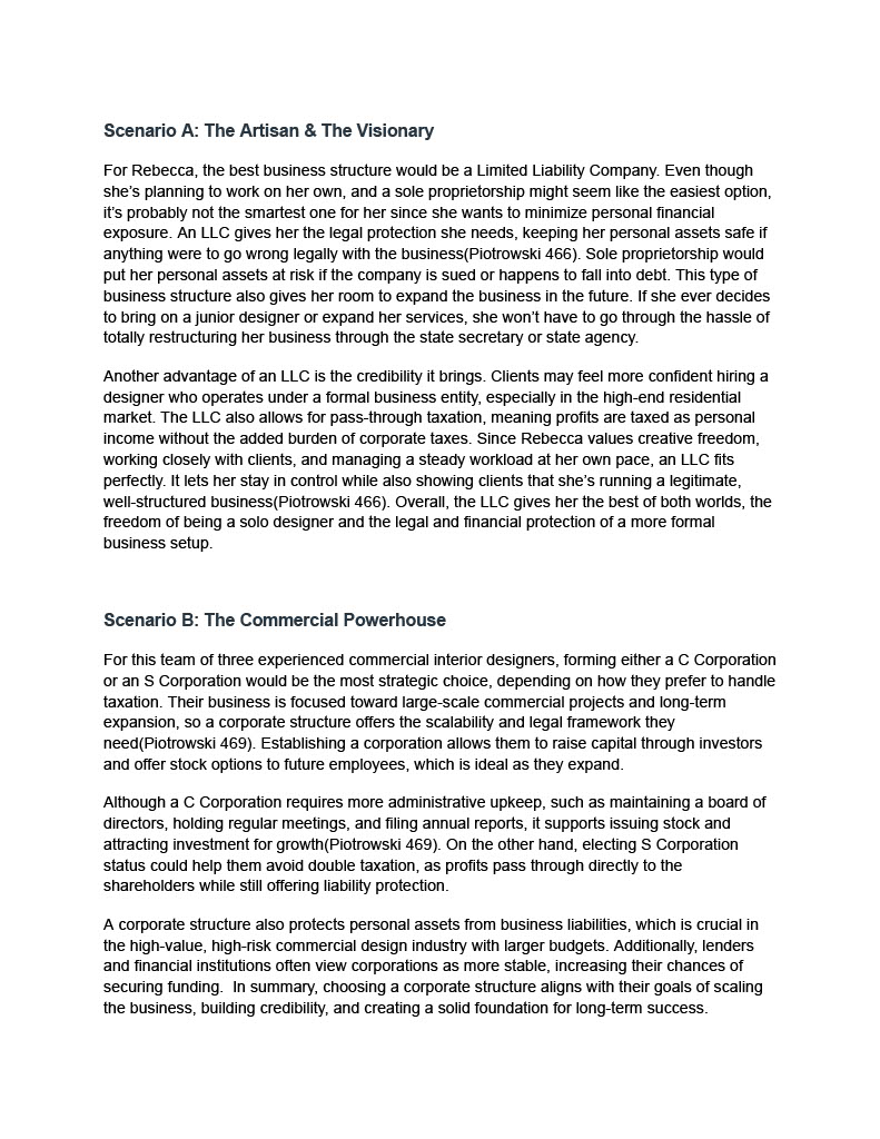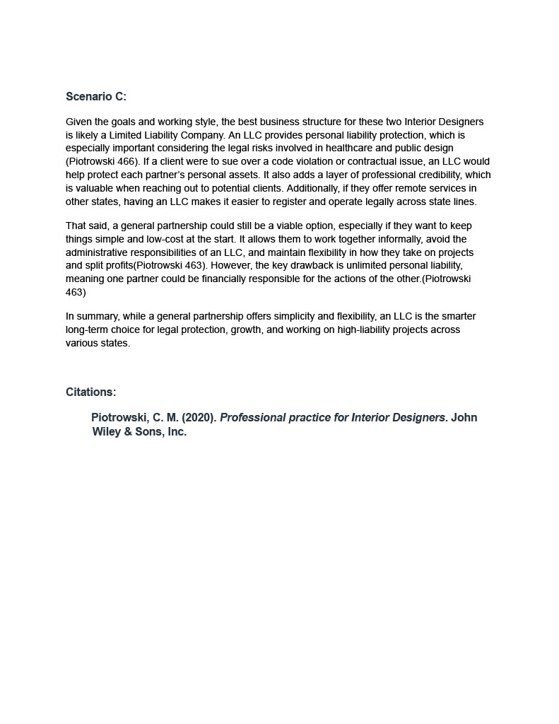 This assignment explores the most effective business formation types for three unique interior design scenarios.Through case-specific analysis, I evaluated the advantages and disadvantages of Limited Liability Companies, general partnerships, and corporate structures. Each recommendation is grounded in legal, financial, and professional considerations relevant to interior design practice. This project enhanced my understanding of how strategic business planning supports creative freedom, financial protection, and long-term success in a variety of design career paths.