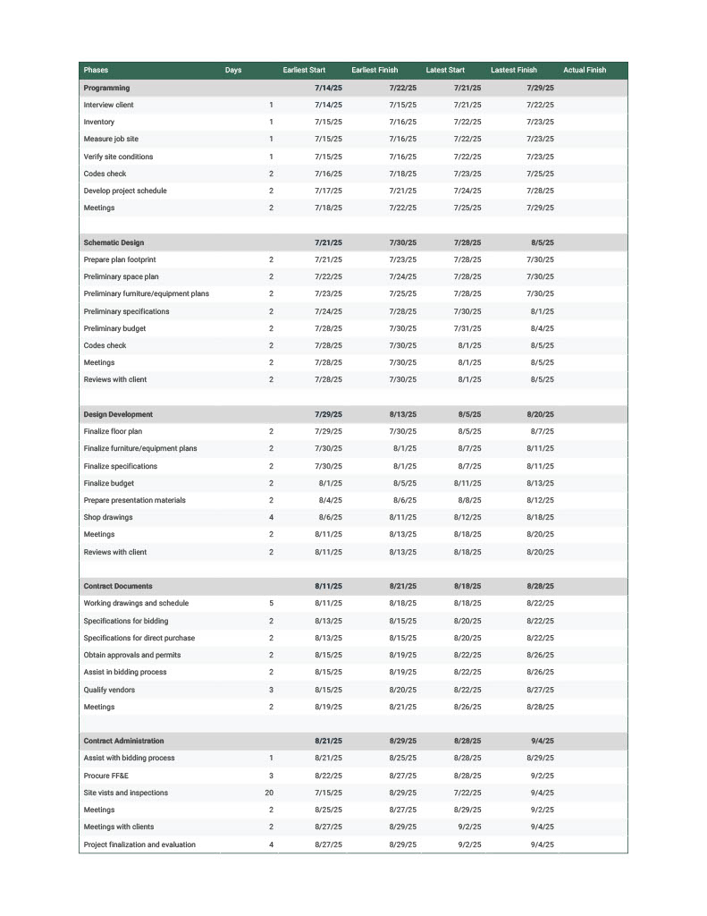 In this assignment, I created a detailed project schedule based on the scope and estimating work from the Fee Estimate above. Using Excel, I organized tasks by project phase, including duration in both days and weeks, and structured the timeline beginning with a start date of July 14th, 2025. This exercise helped me understand how to sequence design activities, allocate time effectively, and manage deadlines.