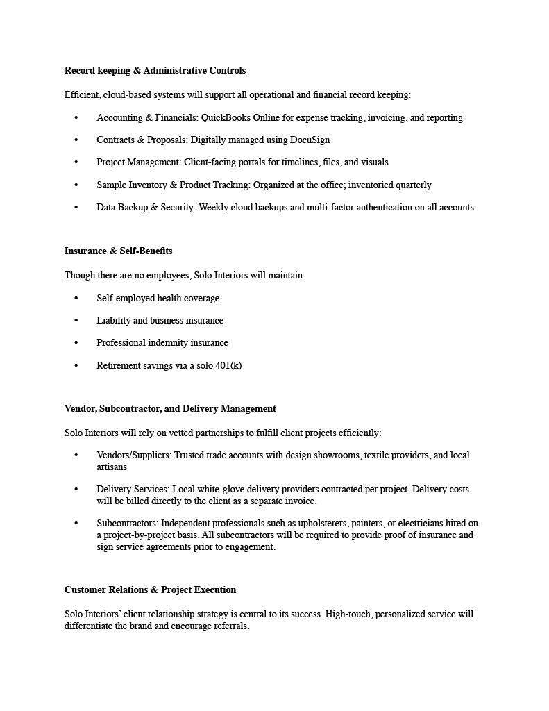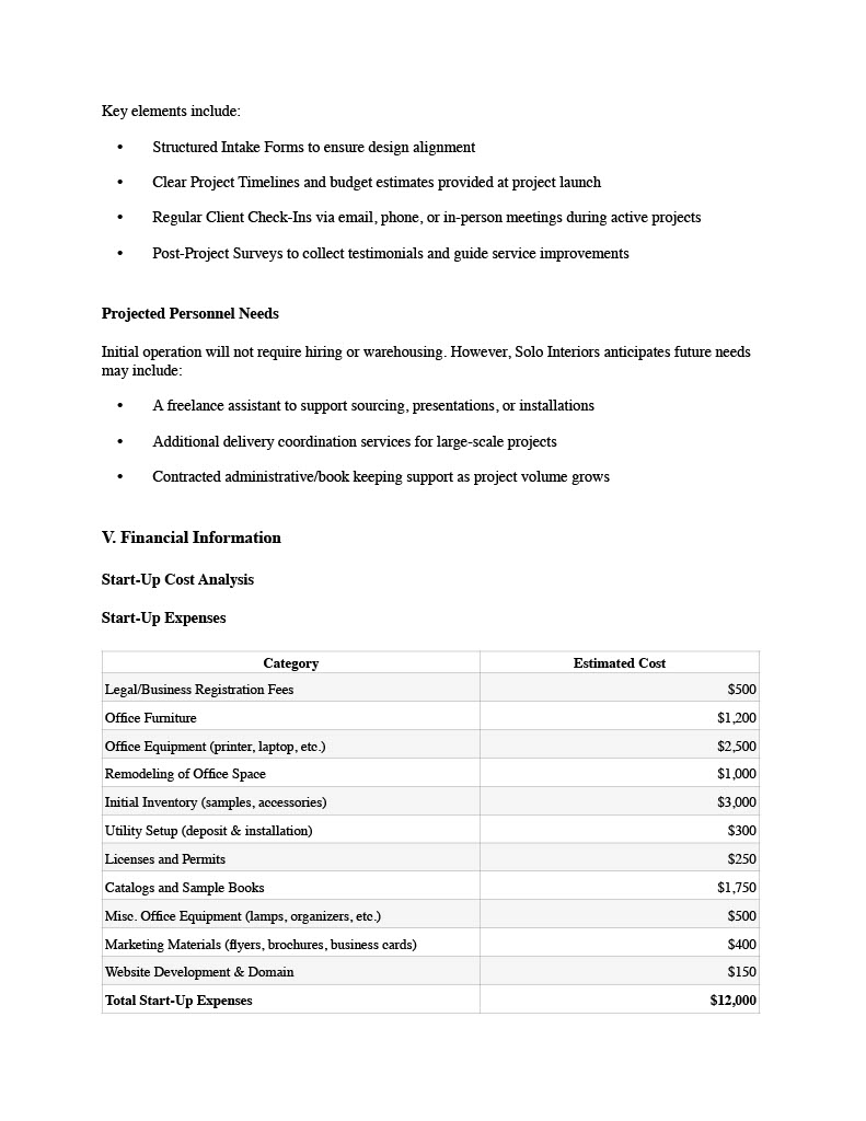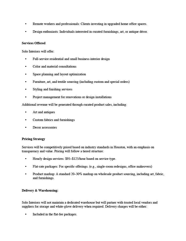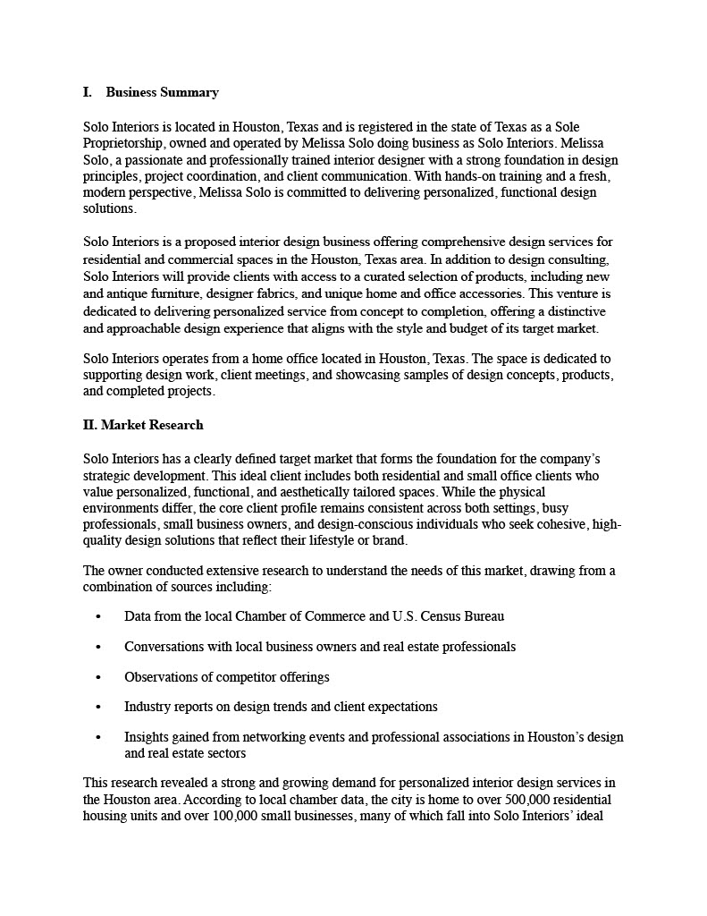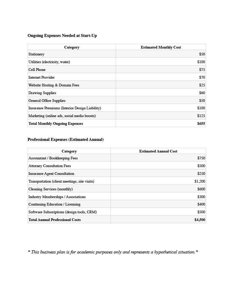 This project involved developing a comprehensive business plan for a fictional interior design company. The plan includes a business summary, market research, marketing strategy, operational logistics, and a detailed startup cost analysis using real-world pricing data. This assignment helped me connect design thinking with strategic business planning, emphasizing how clear goals, market positioning, and financial forecasting shape a successful design practice.